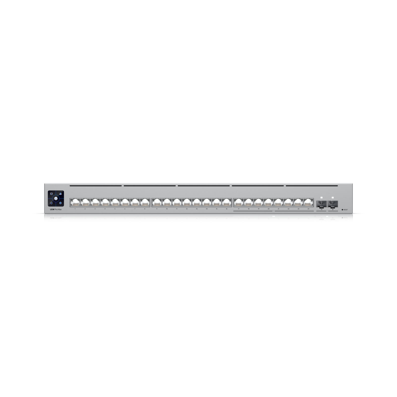 - Pro Max 24 to 24-portowy, warstwy 3, przełącznik z portami 2.5G/1G RJ45 i 10G SFP+, obsługą Etherlighting™, redundancją zasilania oraz zarządzaniem przez UniFi Network.